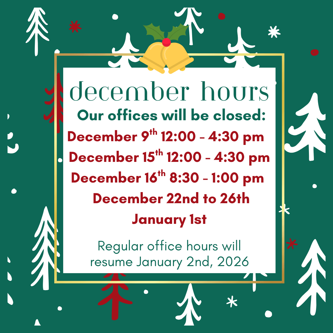 Our office will be closed: December 9th 12:00 – 4:30 pm December 15th 12:00 –