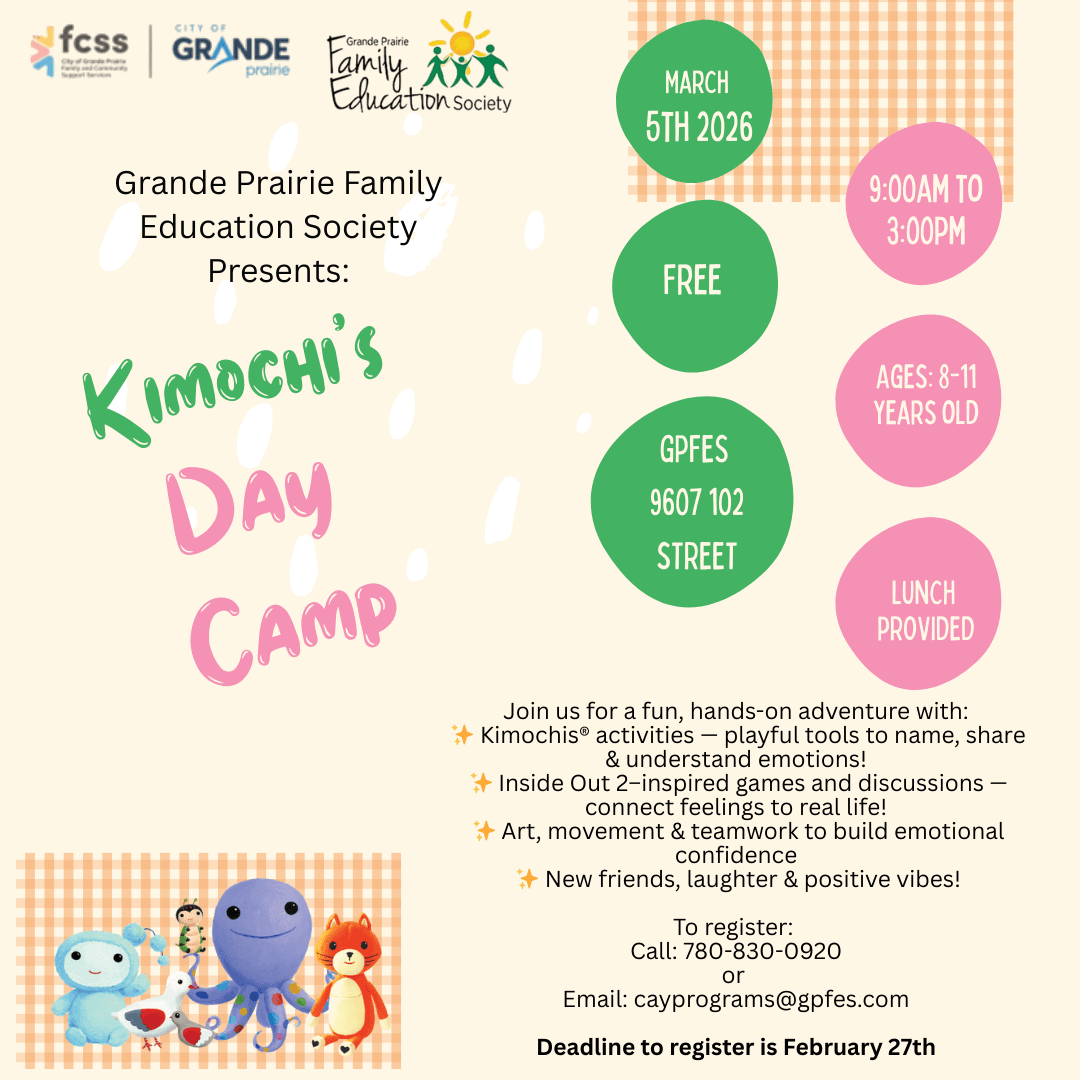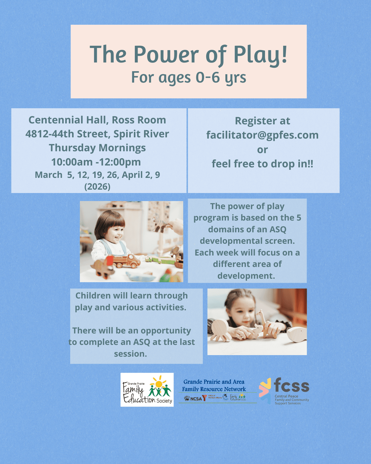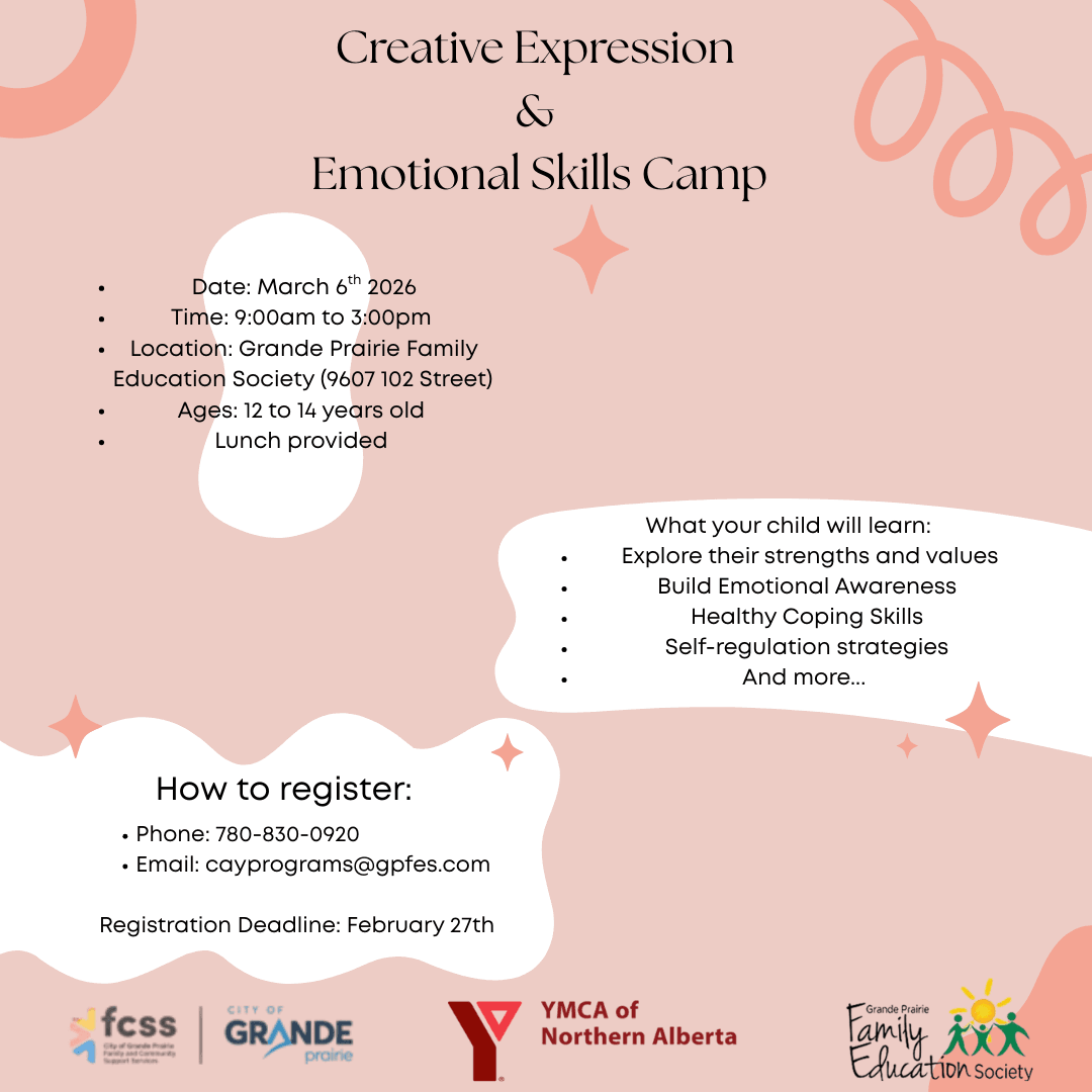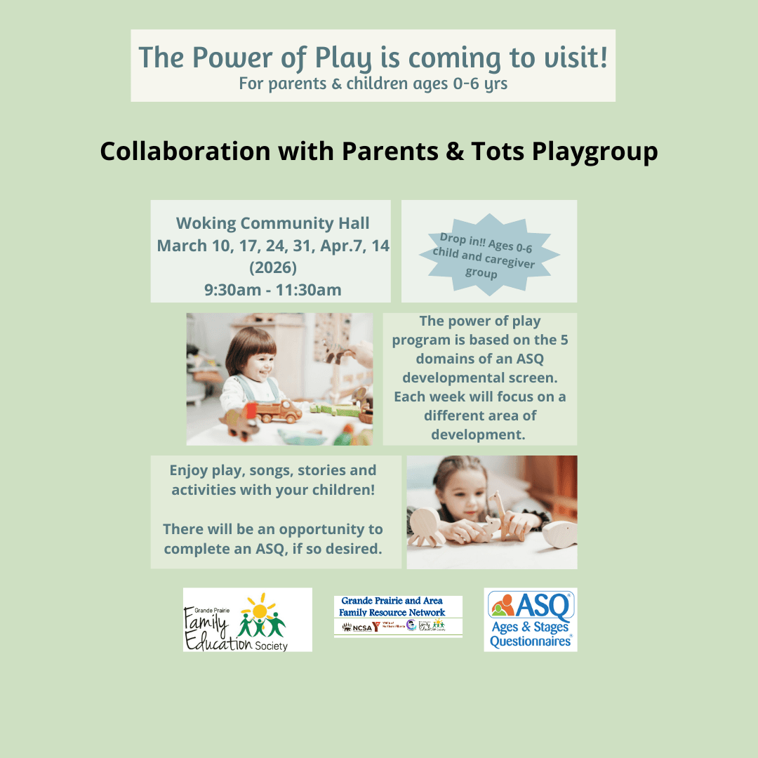 Location: 9607 102 Street (Grande Prairie Family Education Society) Tuesdays from 6:00pm to 7:00pm Mar