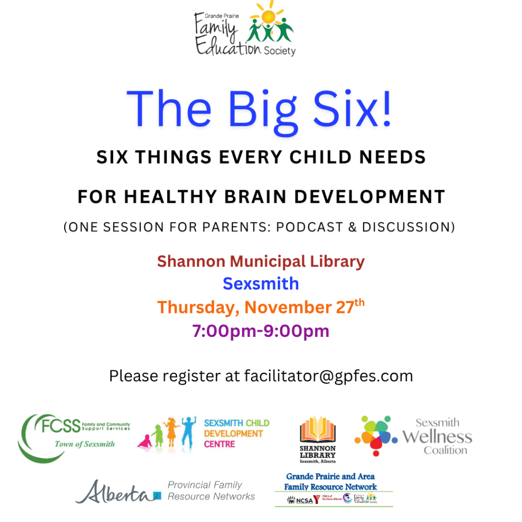 Join the Grande Prairie Family Education Society for The Big Six!—a parent-focused session exploring the six key elements every child needs for healthy brain development. This engaging evening features a podcast and guided discussion that will leave you with practical tools to support your child’s growth and well-being. The session takes place at the Shannon Municipal Library in Sexsmith on Thursday, November 27, from 7:00 PM to 9:00 PM. To register, please email facilitator@gpfes.com.