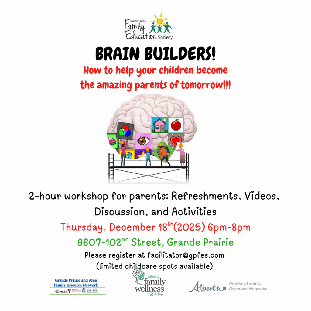 Join the Grande Prairie Family Education Society for Brain Builders!, a free 2 hr workshop designed to help parents support their children in developing the skills and understanding they’ll need to become confident, caring adults. Enjoy an evening of refreshments, videos, discussion, and hands-on activities as you learn practical ways to nurture your child’s growing mind. The session takes place on Thursday, December 18th, from 6–8 PM at Grande Prairie Family Education Society. To attend, please register by emailing facilitator@gpfes.com.