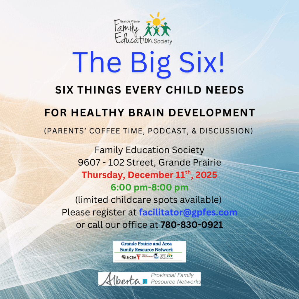 Join the Grande Prairie Family Education Society for The Big Six!—a parent-focused session exploring the six key elements every child needs for healthy brain development. This engaging evening features a podcast and guided discussion that will leave you with practical tools to support your child’s growth and well-being. The session takes place at Grande Prairie Family Education Society on Wednesday, December 11th, from 6:00 PM to 8:00 PM. To register, please email facilitator@gpfes.com.