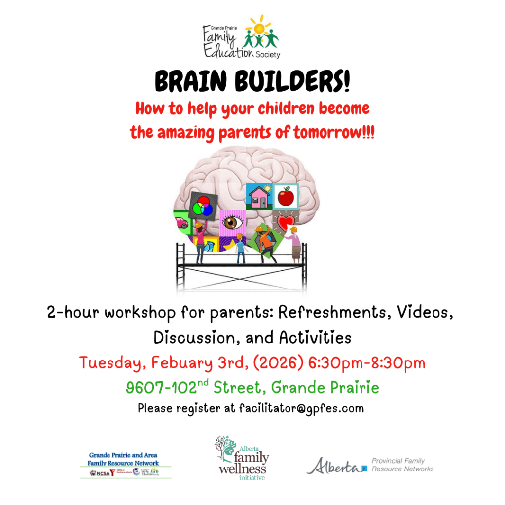 Join the Grande Prairie Family Education Society for Brain Builders! a free 2 hr workshop designed to help parents support their children in developing the skills and understanding they’ll need to become confident, caring adults. Enjoy an evening of refreshments, videos, discussion, and hands-on activities as you learn practical ways to nurture your child’s growing mind. The session takes place on Tuesday, February 3rd, from 6:30–8:30 PM at Grande Prairie Family Education Society. To attend, please register by emailing facilitator@gpfes.com.