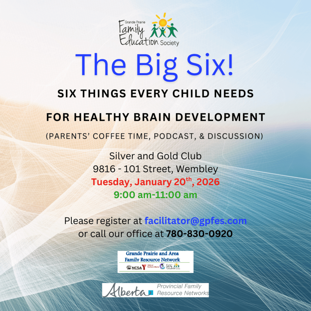 Join the Grande Prairie Family Education Society for The Big Six!—a parent-focused session exploring the six key elements every child needs for healthy brain development. This engaging evening features a podcast and guided discussion that will leave you with practical tools to support your child’s growth and well-being. The session takes place at the Silver and Gold Club in Wembley on Tuesday, January 20th, from 9:00 – 11:00 am. To register, please email facilitator@gpfes.com.